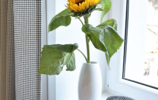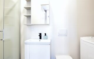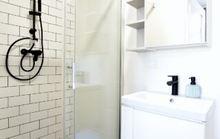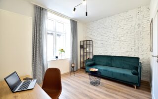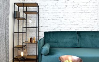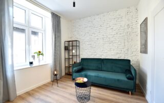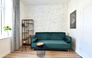 The bottle green sofa blends beautifully with the whitewashed brick wall in this apartment. In the bathroom, we also focused on black accessories – bathing under a large black rain shower is a pleasure.