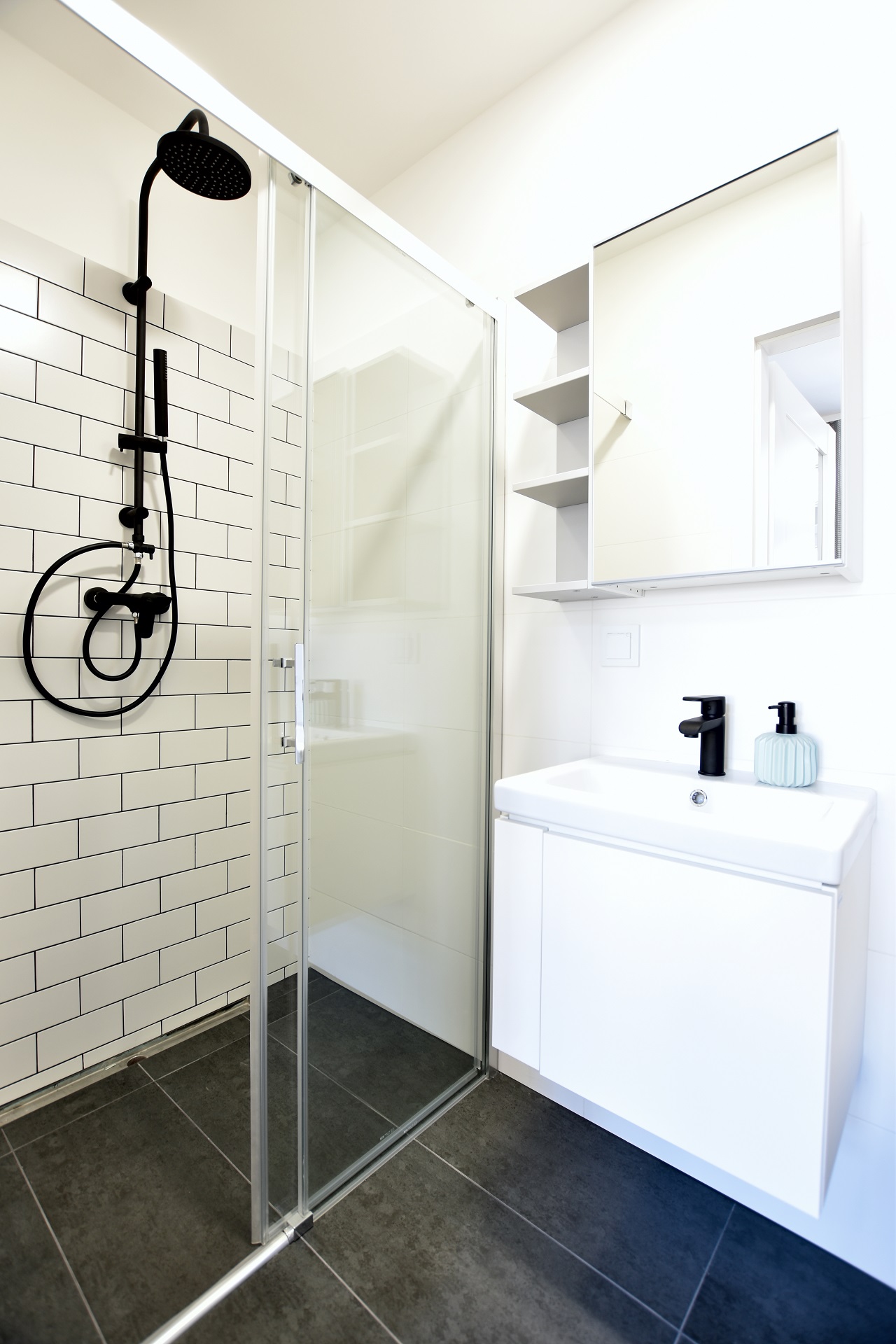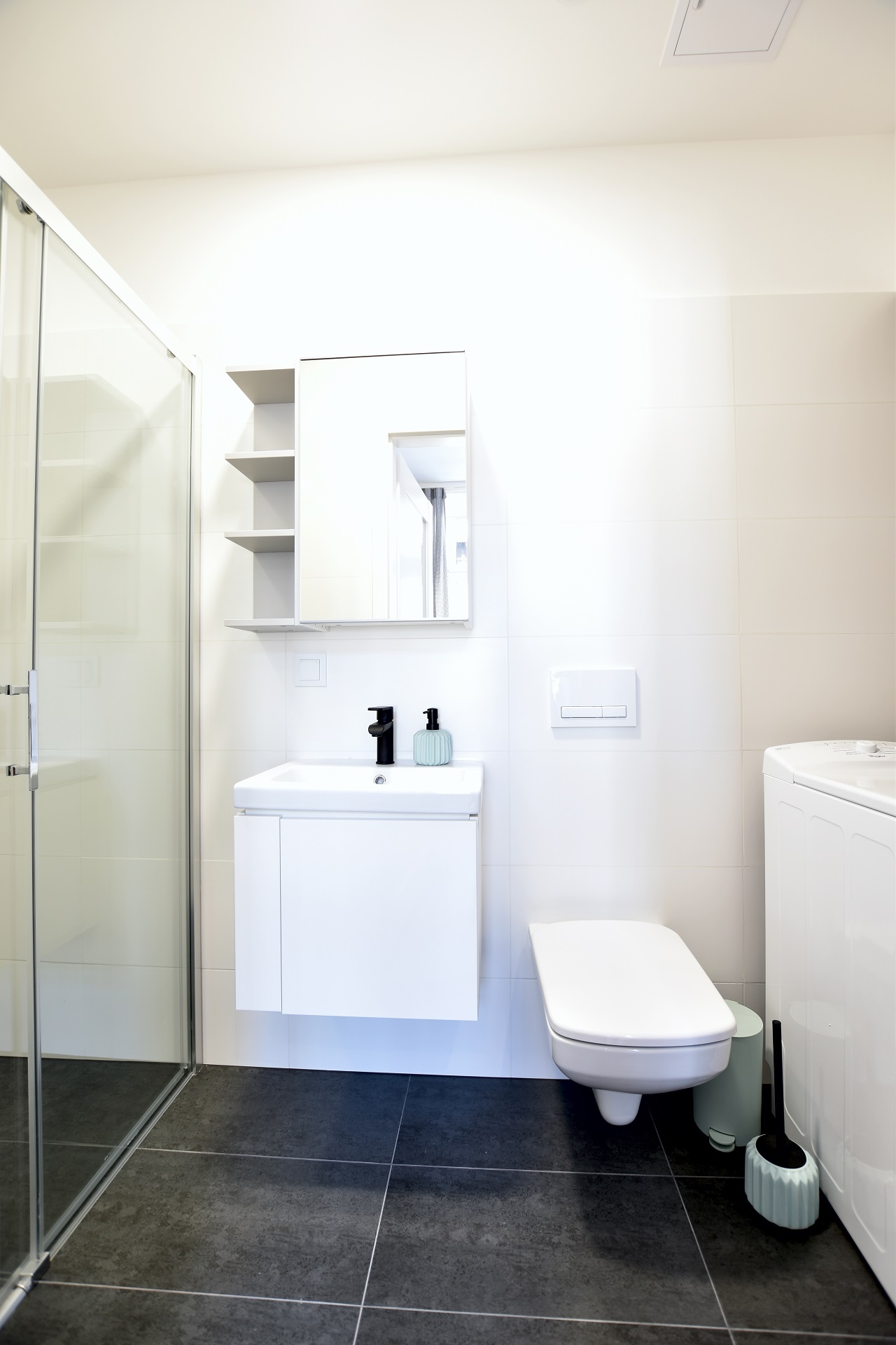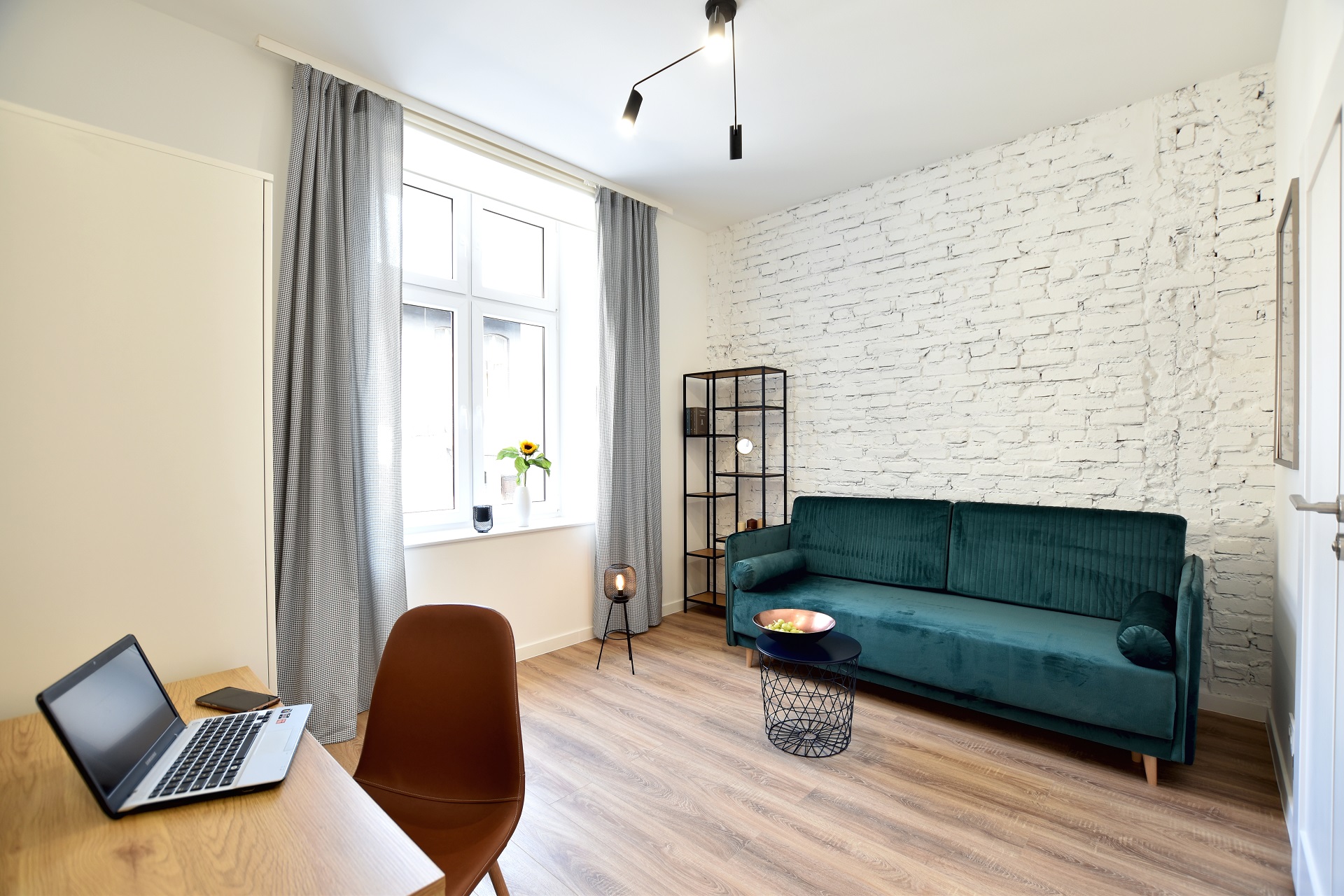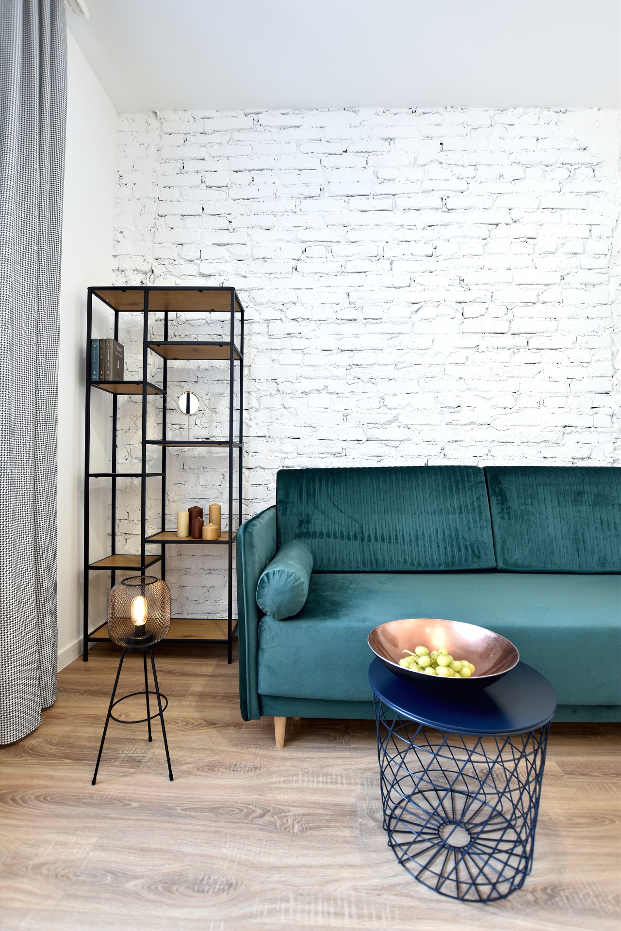 The bottle green sofa blends beautifully with the whitewashed brick wall in this apartment. In the bathroom, we also focused on black accessories – bathing under a large black rain shower is a pleasure.