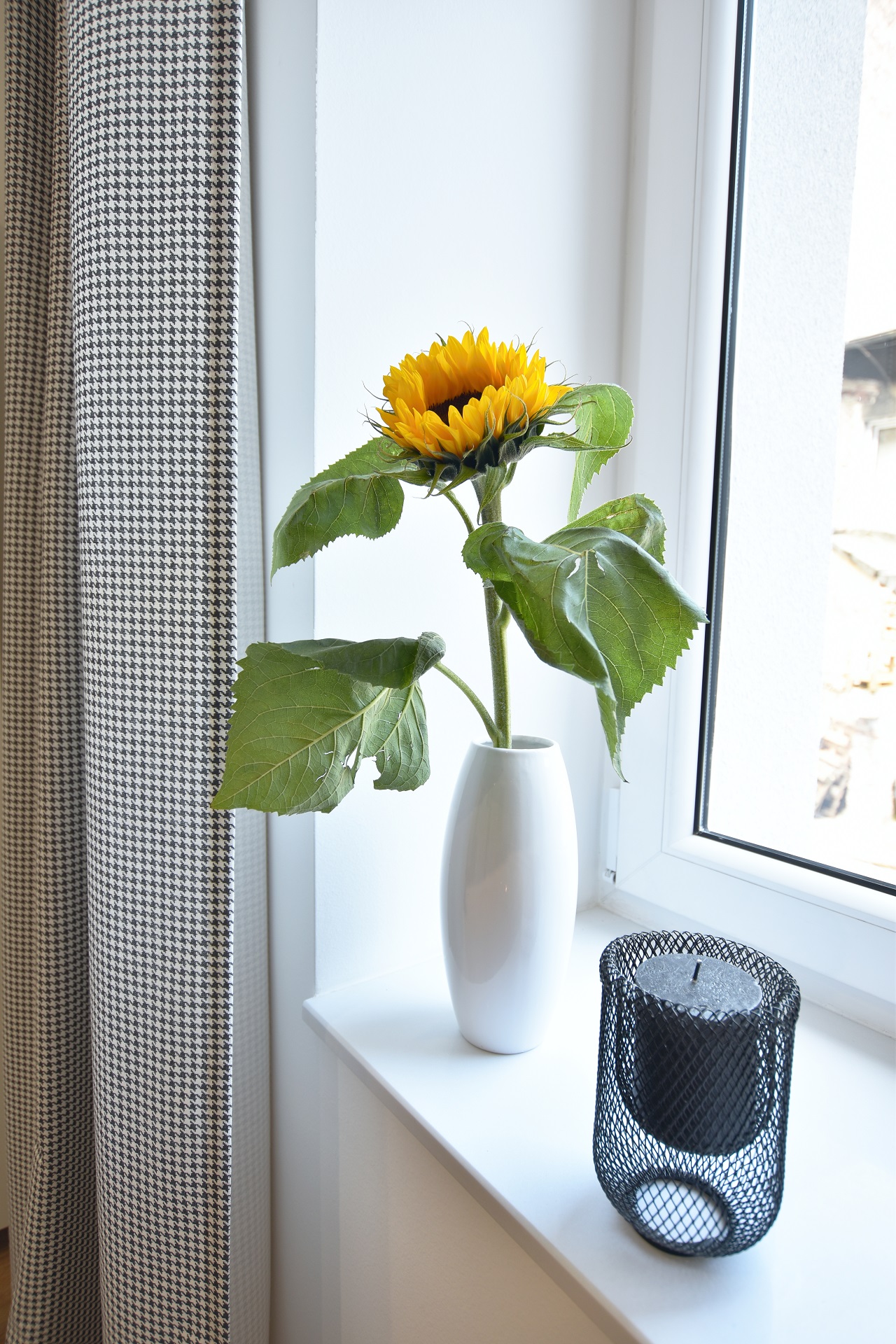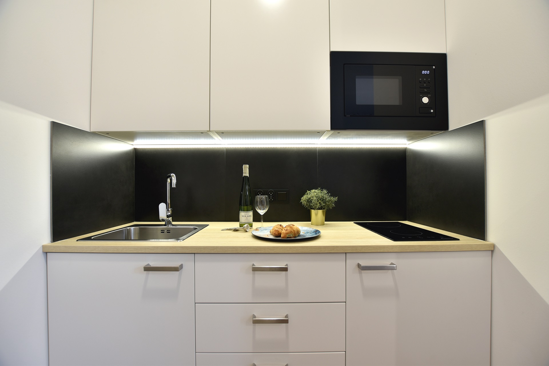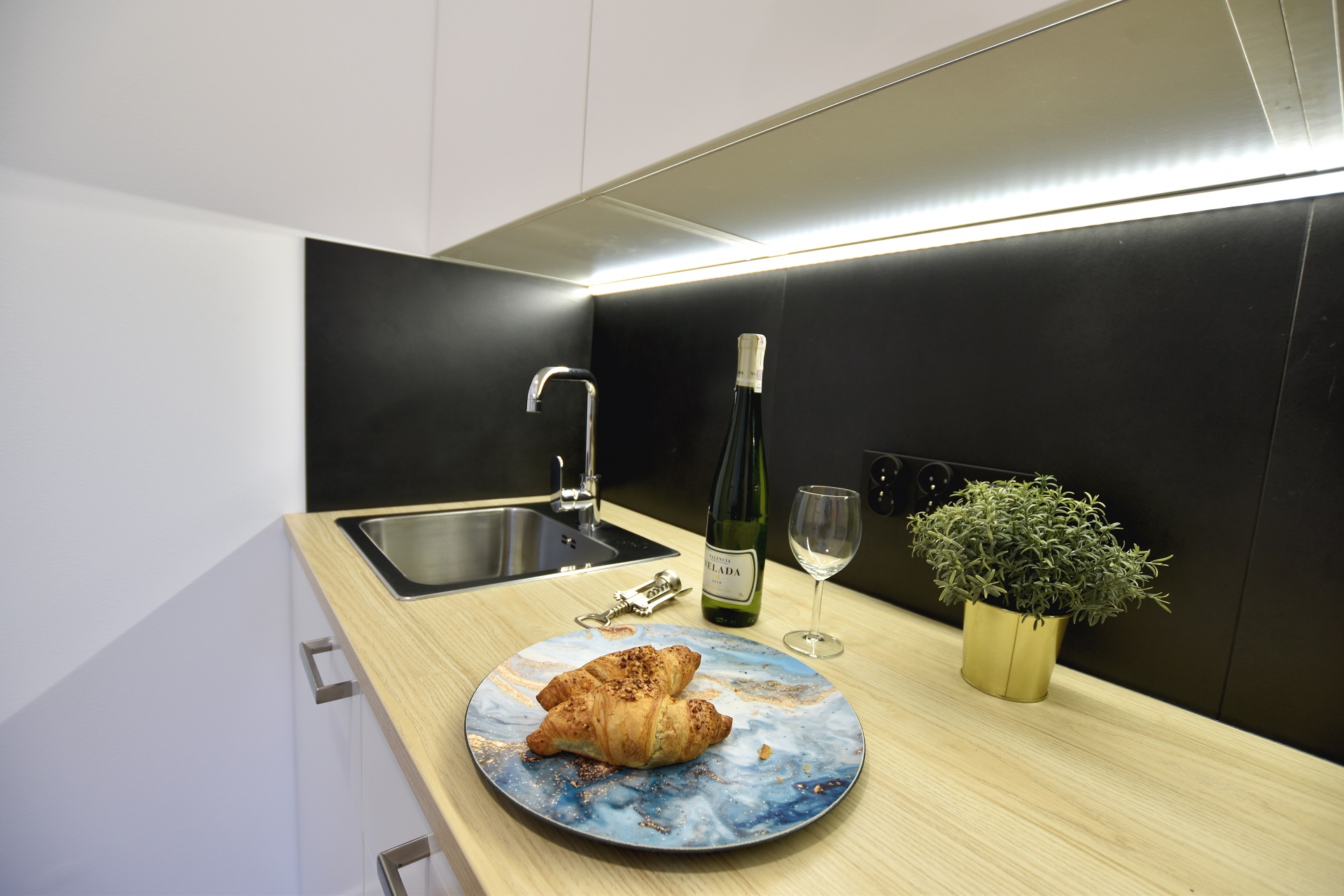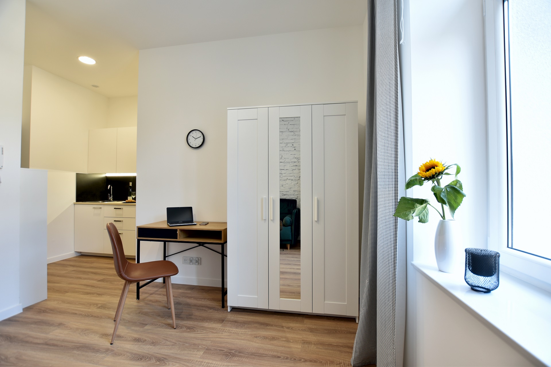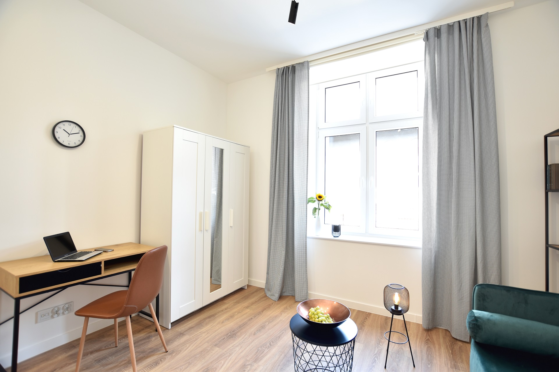 The bottle green sofa blends beautifully with the whitewashed brick wall in this apartment. In the bathroom, we also focused on black accessories – bathing under a large black rain shower is a pleasure.