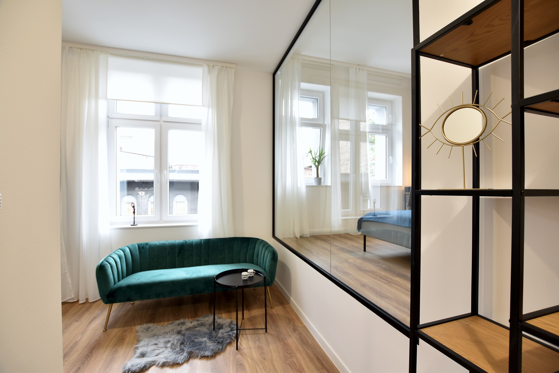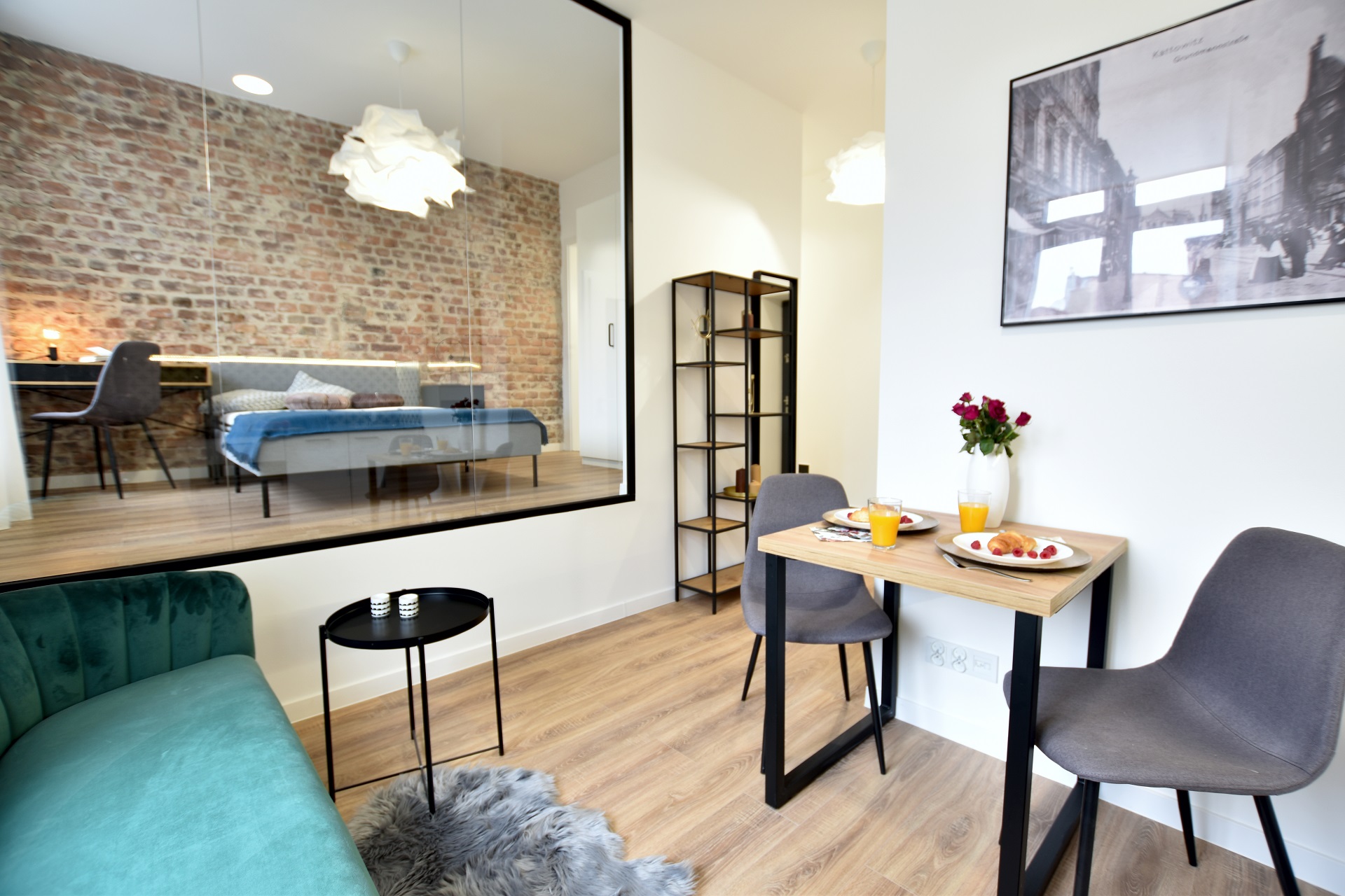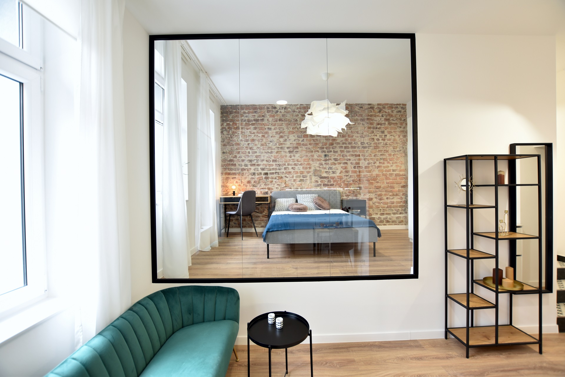 This apartment has many views… all thanks to the glass frame instead of a wall! The bedroom can be covered and uncovered depending on the mood.
